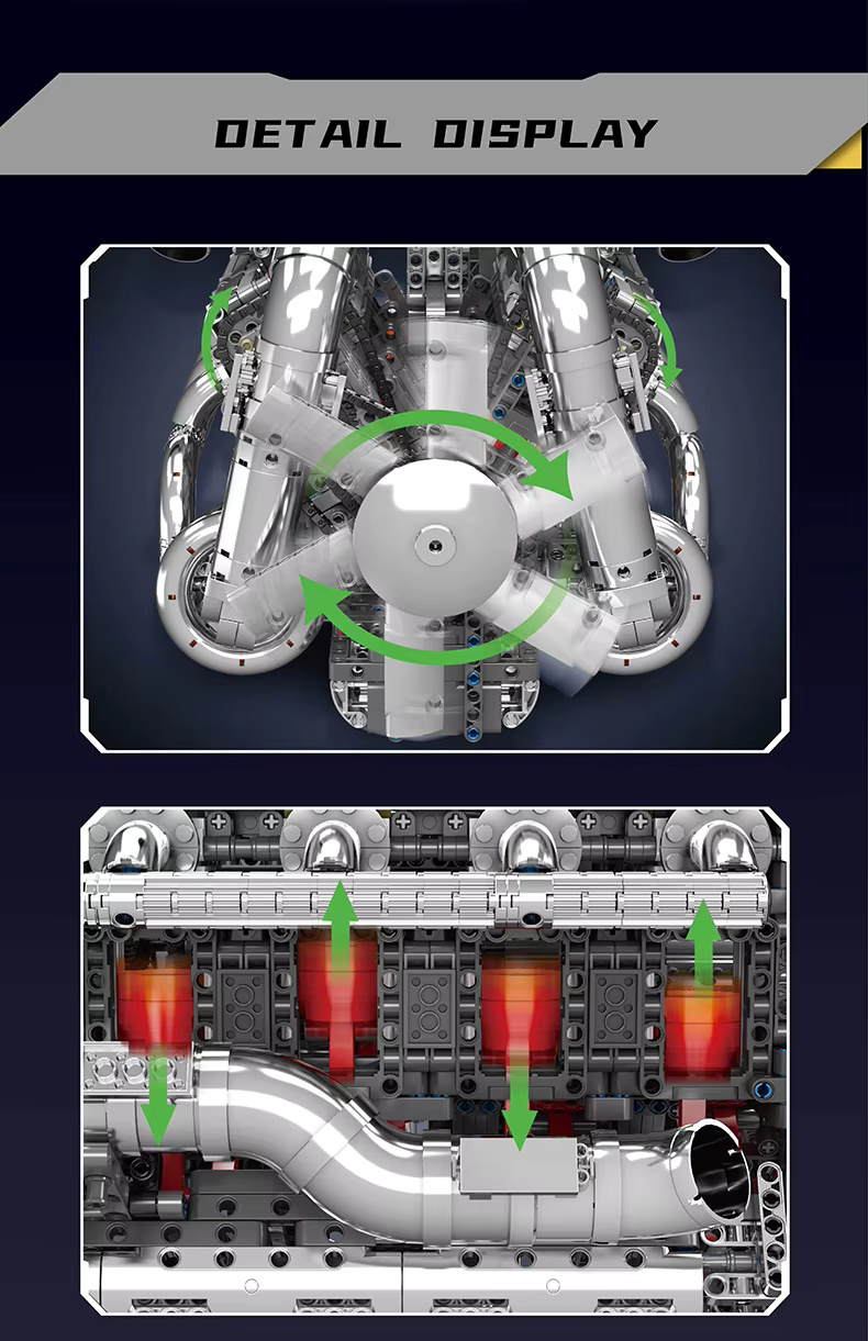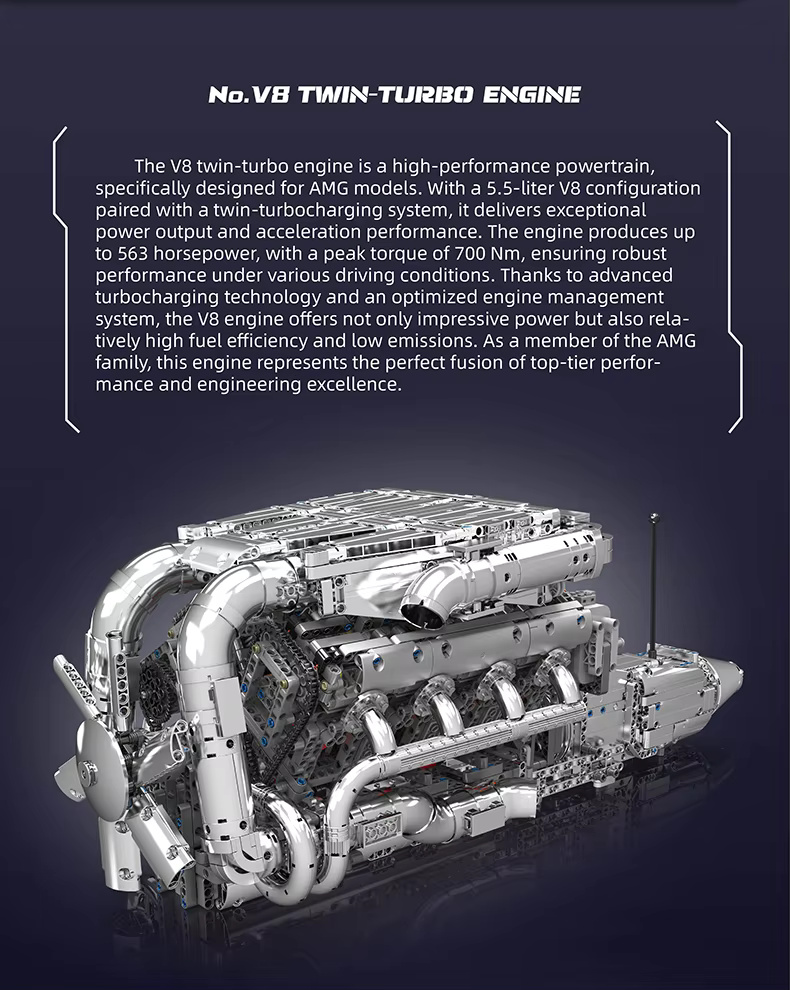 Featuring eight rotating pistons, a detailed valve train system, and a precisely designed exhaust manifold, this model accurately replicates the inner workings of a real twin-turbo V8 engine. The realistic crankshaft and camshaft mechanisms, combined with an intricate exhaust system, highlight its high-performance engineering.