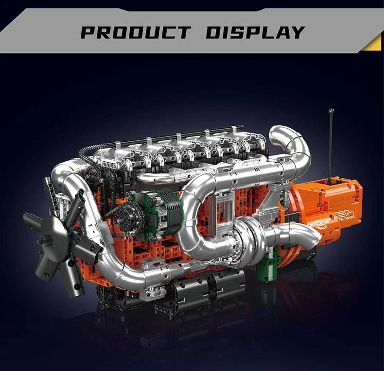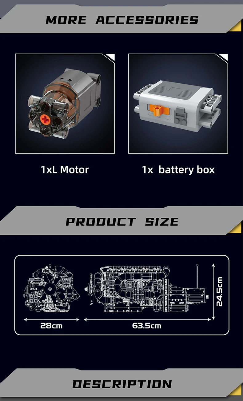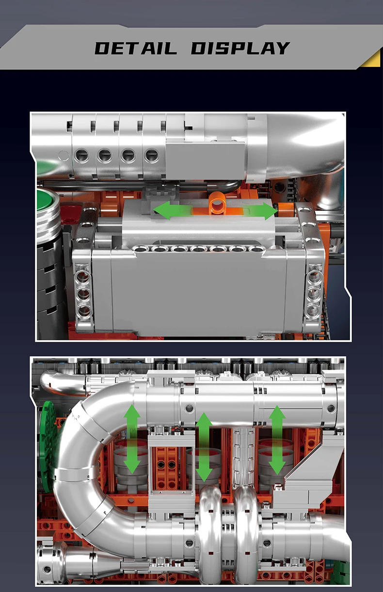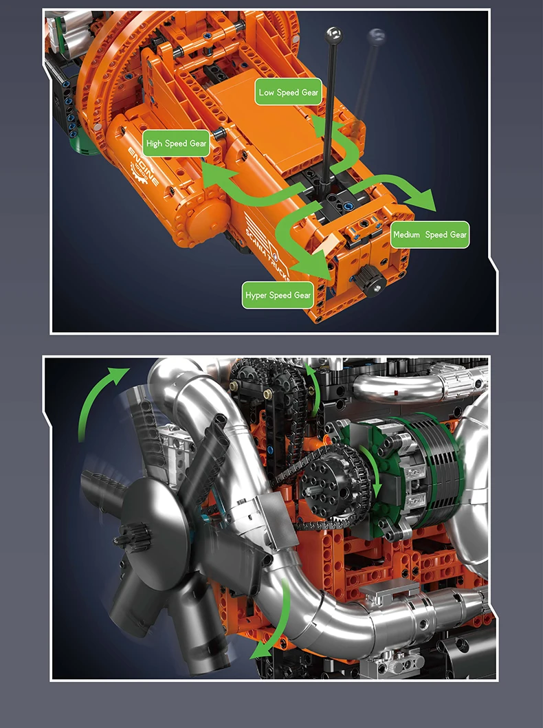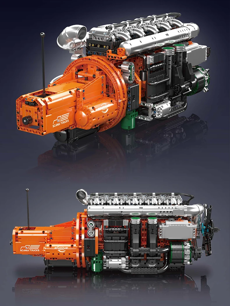 This construction set replicates a powerful truck engine and gearbox using 3236 bricks, measuring 25 inches in length and 9.6 inches in height. A large motor facilitates realistic rotation.