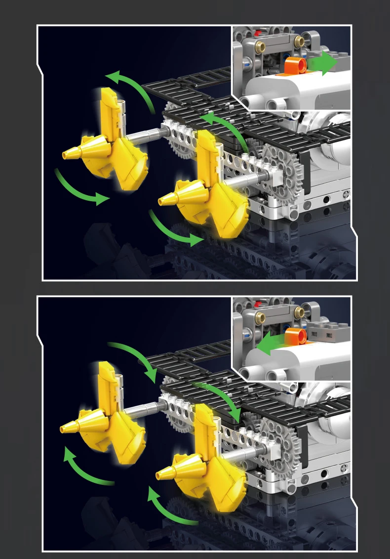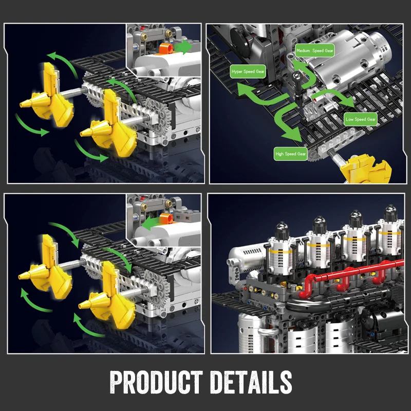 This model is not merely for decoration—it is fully motorized. Activate the L-motor and see the pistons move in unison with the crankshaft, as twin yellow propellers at the back revolve just like those found in functional ship propulsion systems. With various gear settings, you can alternate between low, medium, high, and hyper speeds, providing a hands-on experience of mechanical power at several levels.