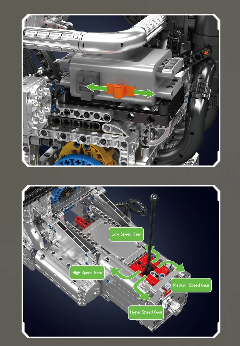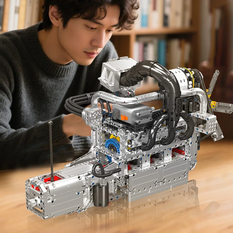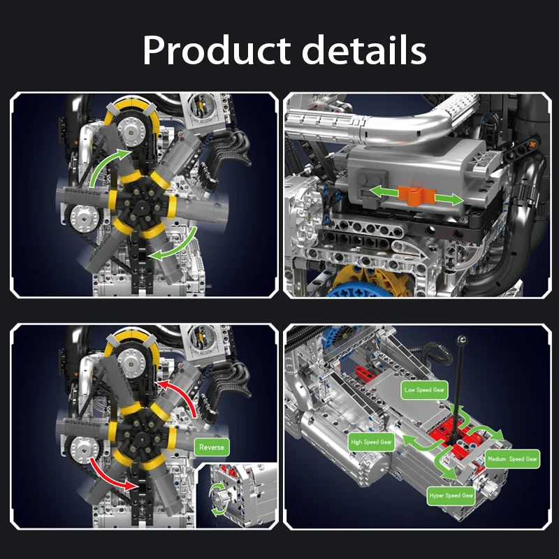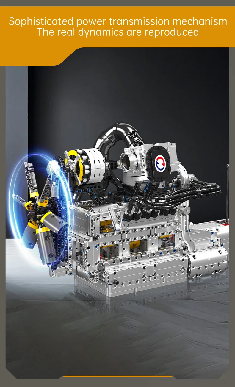 This extensive model embodies the compact yet high-revving essence of the classic Wankel design, offering remarkable detail. Numerous pipes on the sides and top authentically depict air intake and cooling systems, enhancing its mechanical realism. At the top, a black-and-silver intake unit mimics a performance intake manifold or supercharger module, contributing to a heightened racing atmosphere. The chain-driven cooling fan at the front provides an accurate glimpse into how rotary engines operate regarding speed and efficiency within a small framework. Powered by an L motor and battery box, the engine comes to life with a simple switch. The interlinked gears and chain drive replicate the actual motion of a rotary engine, with spinning fans and activated internal components functioning in complete mechanical unity. A 4-speed gearbox facilitates seamless shifts between low, medium, high, and hyper speeds, allowing you to relish the excitement of the rotary’s high-RPM powerband. This blend of authenticity, playability, and display appeal makes it a perfect option for fans of engineering and model building.