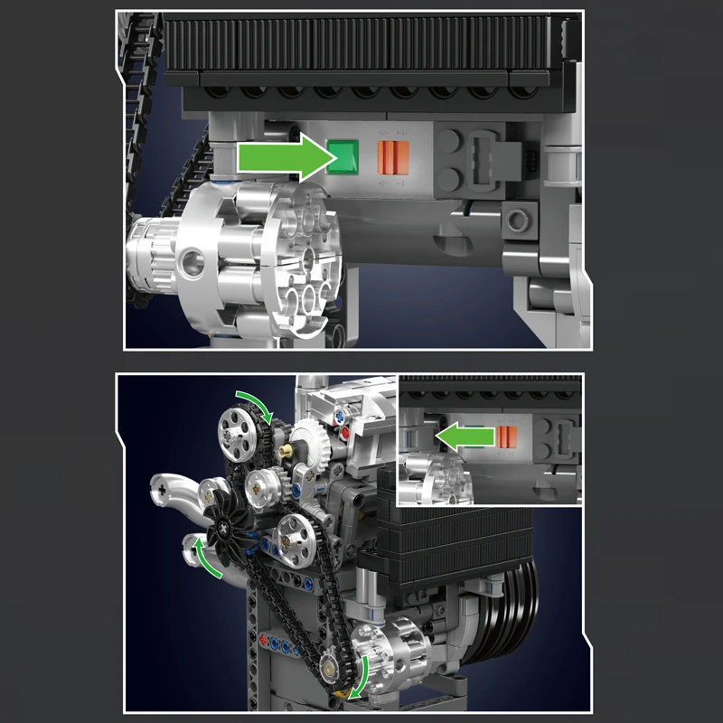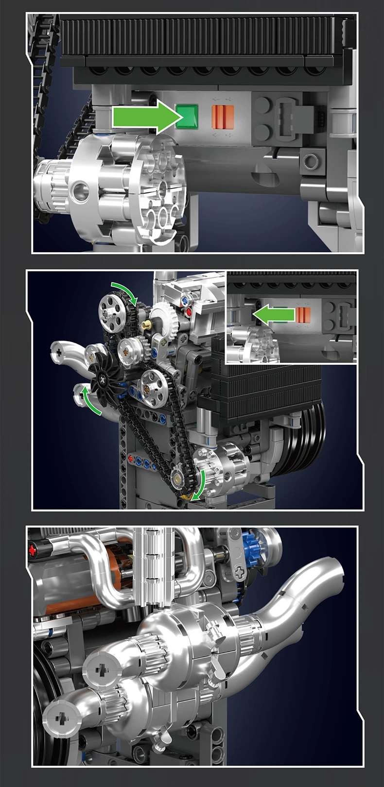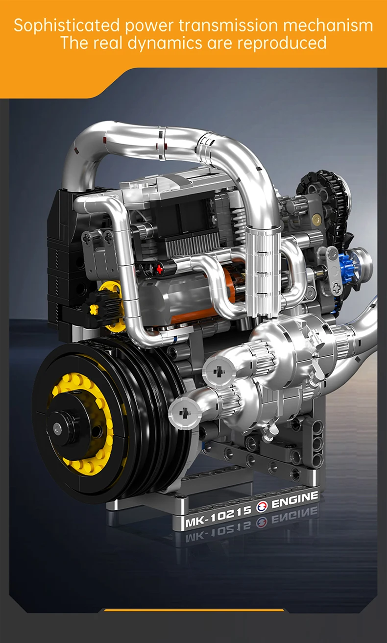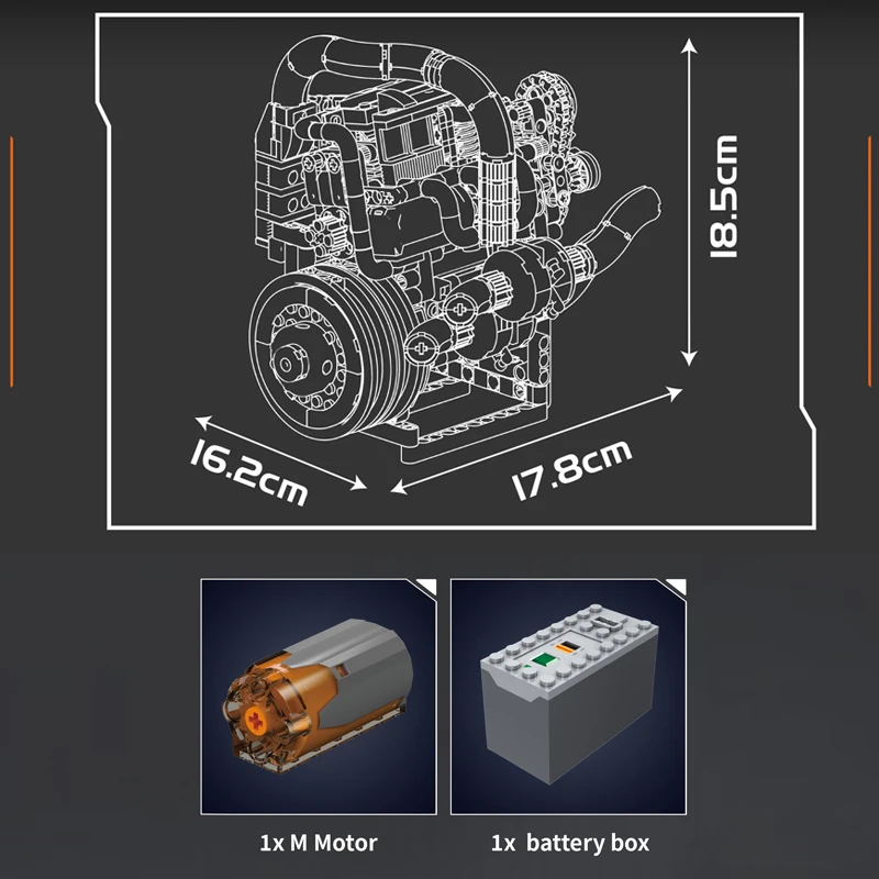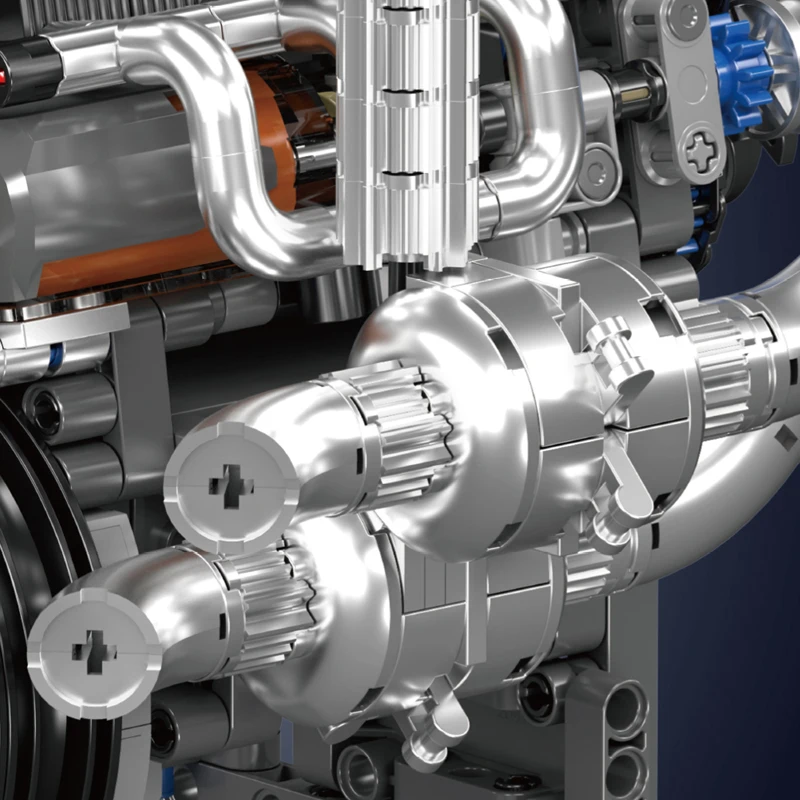 Dive into the realm of high-performance engineering with the Koenig Supercar Engine Building Set. This kit includes 739 finely detailed pieces that accurately represent the complex mechanics of a contemporary supercar engine. Measuring 18 cm long, this compact marvel features rotating pistons, a working timing chain, visible gear assembly, and a crankshaft, all powered by a medium-sized electric motor and an included battery box. Adorned with chrome-plated accents, the engine showcases carefully crafted components such as an intricate radiator, a realistic turbocharging system, and a beautifully detailed exhaust manifold. Ideal for automotive enthusiasts and collectors who value precision and realistic operation in their mechanical models.