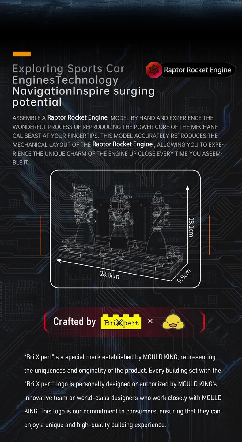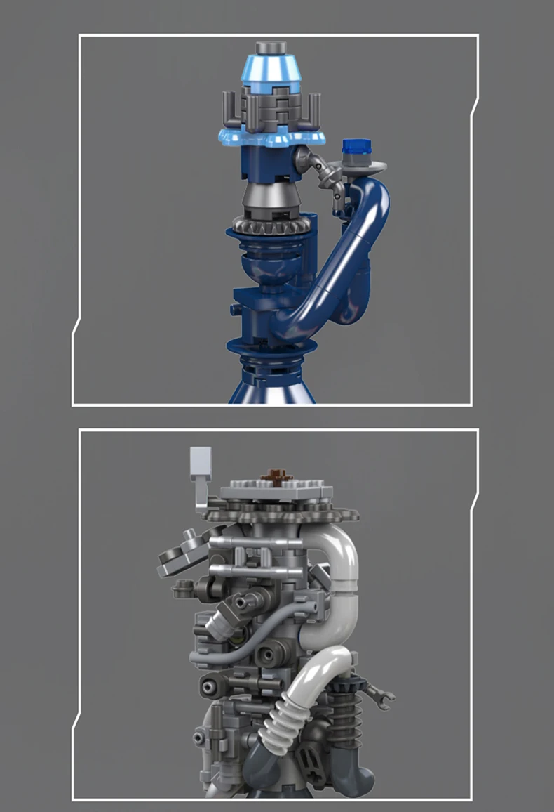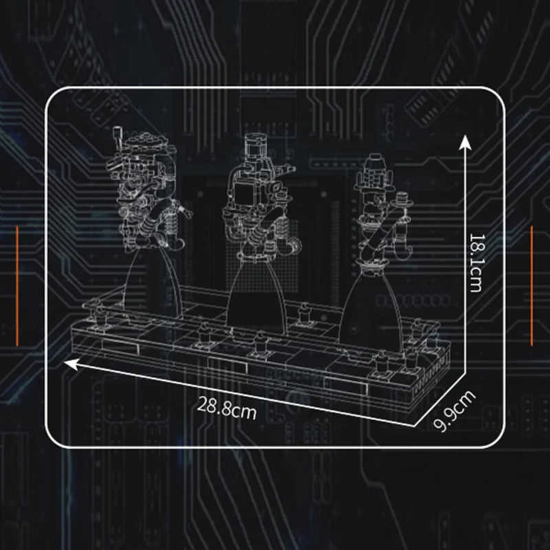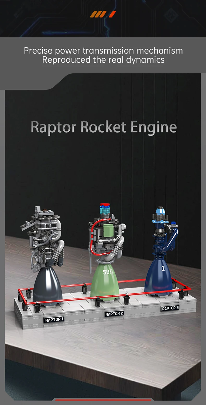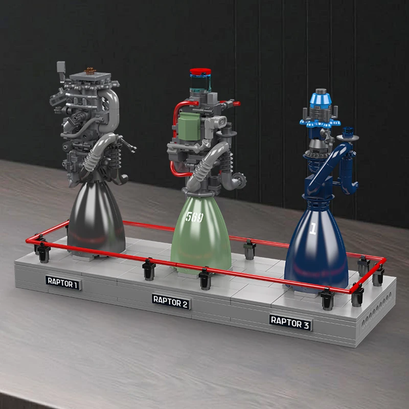 This static display set features three unique engine models—Raptor 1, Raptor 2, and Raptor 3—each built with realistic contours, intricate pipework, and engine-specific identifiers. From the turbo pump assemblies to the combustion chambers, every detail is thoughtfully designed to echo the aesthetics of real aerospace components.
