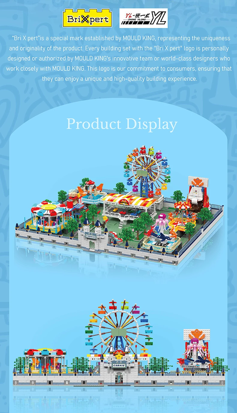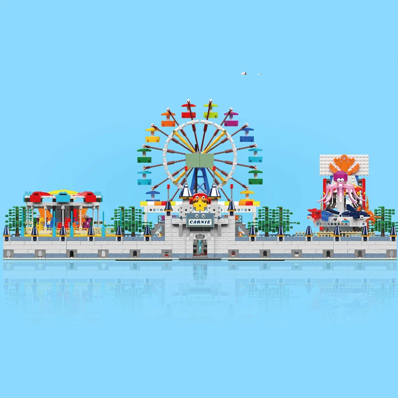 Create the excitement of a full amusement park within your own space with the impressive 5220-piece Mould King 11022 building kit. This set features a lively carnival atmosphere with notable attractions like a grand Ferris wheel, bumper cars sheltered by a colorful awning, a whirling carousel, and many additional rides. Each ride is constructed independently using a modular approach, allowing for a customizable fairground arrangement. From the signature “Carnie” entrance gate to the thrilling pirate ship and octopus spinner, every aspect mirrors a genuine theme park experience. Measuring 36.8 cm in height and spanning 83.3 cm by 90.5 cm, the completed model serves as a striking display for enthusiastic builders and amusement park lovers alike. It also pairs beautifully with other sets from the Mould King amusement park series, enabling a larger urban setup.