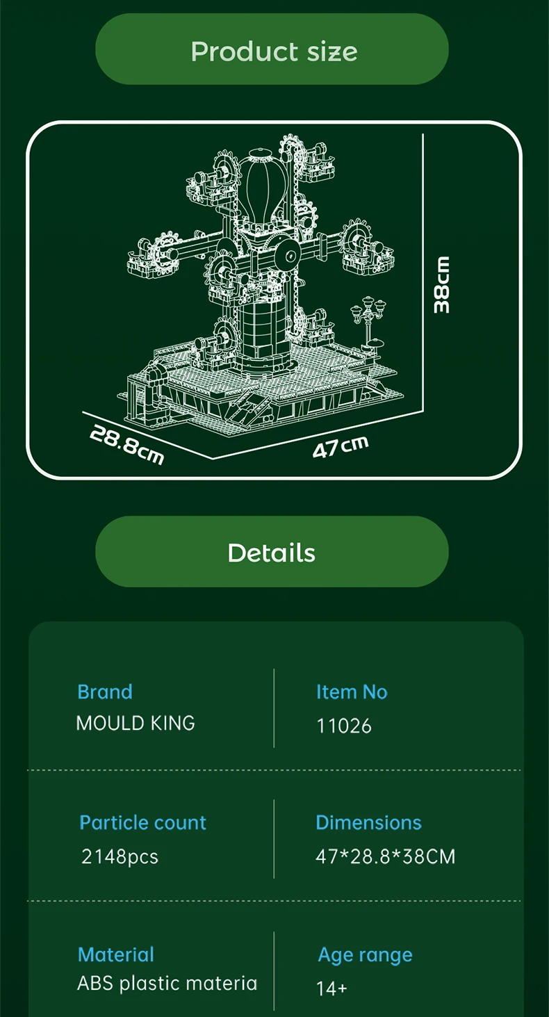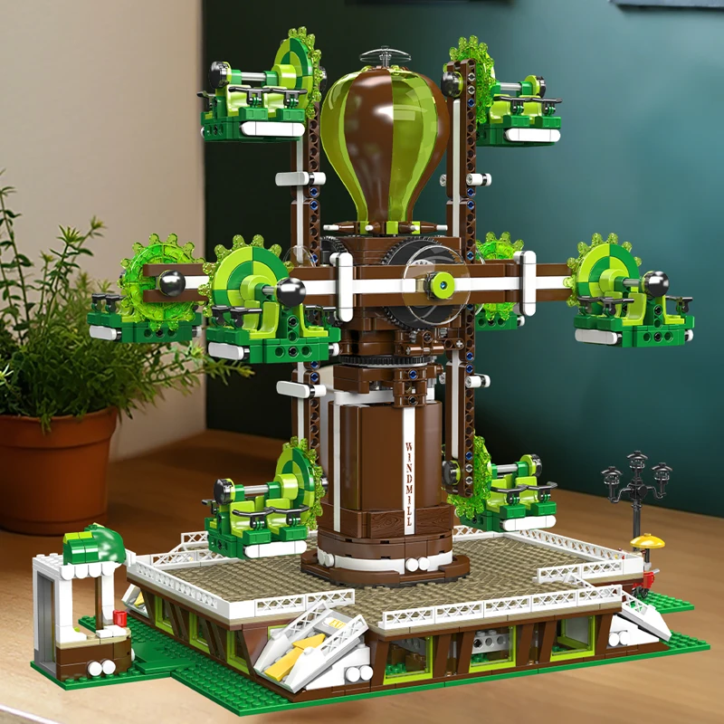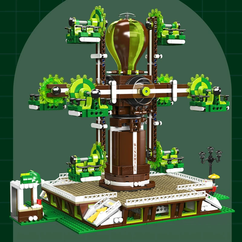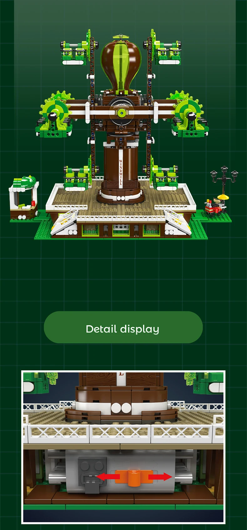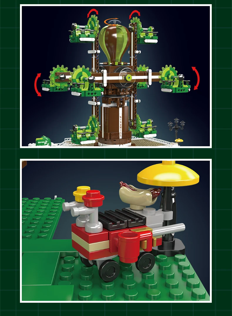 Measuring 38 cm in height and composed of 2,148 precision-molded bricks, the set replicates a large rotating ride driven by a motorized gear mechanism. Central to the design is an eye-catching green tree bulb, perched on a tall spinning trunk, representing the clean energy of nature. When the XL motor is turned on, it activates the central shaft, setting the branches and passenger seats into circular motion—simulating the experience of a real carnival ride.
