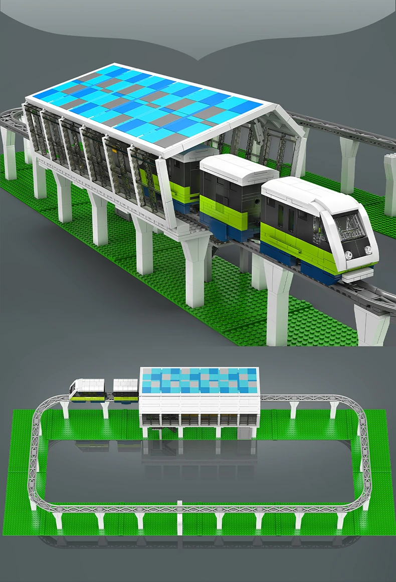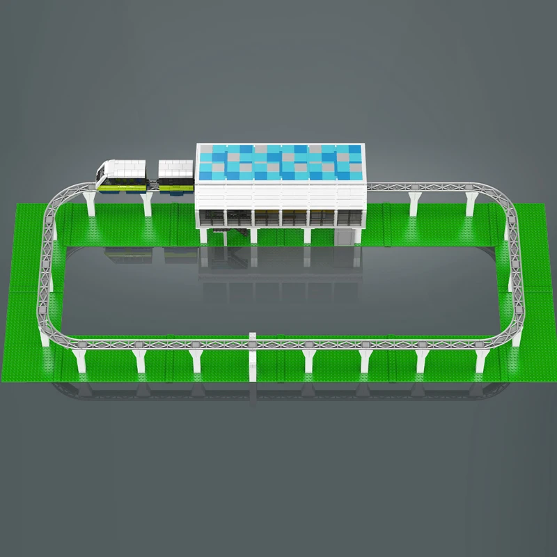 The entire track system is built on high-rise pillars, mimicking real-world viaducts for faster and smoother train operation. This elevated structure surrounds the station in a complete loop, providing an engaging visual and functional setup.