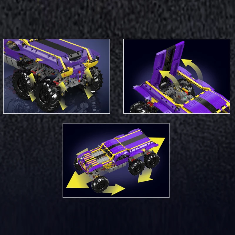 Crafted from 2,014 premium ABS components, this impressive 6×6 crawler merges striking design with sophisticated mechanical features. The bold purple-and-gold exterior gives the vehicle a fierce, commanding appearance. With six oversized tires and a lifted chassis, it offers outstanding ground clearance, preparing it for any tough terrain.
