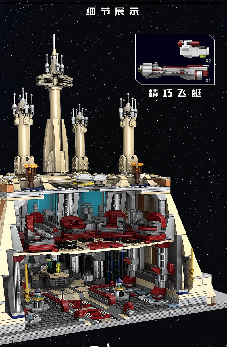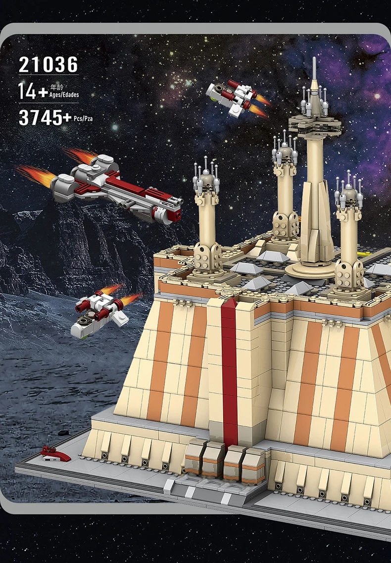 With over 3,745 pieces, this highly detailed set offers endless hours of building and imaginative play. The temple’s intricate design features iconic elements from the space war universe, including the entrance hall, council chamber, and throne room.