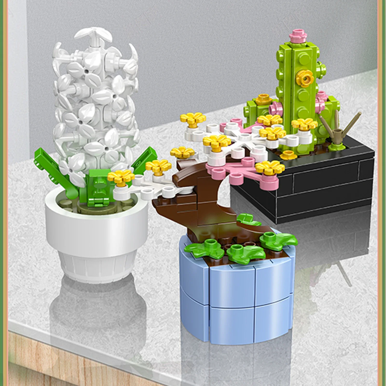 This 227-piece collection features three distinct plant designs, each contained in its own miniature pot. A tall white floral column ascends like a bouquet of blooms, representing purity and growth. Next to it, a graceful bonsai with pink and yellow flowers extends its delicate branches in harmonious form — a tribute to spring and renewal. Completing the set is an adorable green cactus adorned with tiny pink and yellow blossoms, reflecting the resilient charm of desert life. Each model stands approximately 4 inches tall, making them ideal for use as desktop decorations, shelf accents, or thoughtful handmade gifts.
